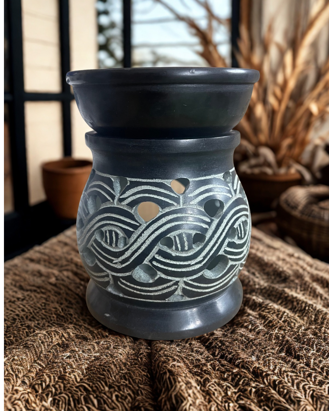 Cette lampe d’arôme en stéatite polie est façonnée dans une pierre à savon lourde et lisse, aux nuances uniques — parfois sombres, claires ou délicatement marbrées. Chaque lampe est ainsi une création singulière de la nature.