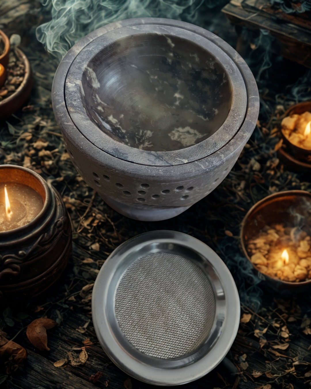 Son tamis permet de brûler vos mélanges d’encens, de résines ou de poudres naturelles sans charbon, simplement avec une bougie chauffe-plat.